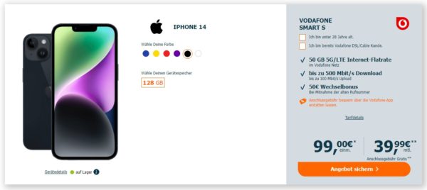 Apple iPhone 14 + 50GB LTE + Alles-Flat im Vodafone-Netz für 39,99€/Monat – eff. 8,37€/Monat