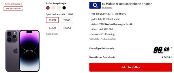 Tarif mit massig Datenvolumen gesucht, bei MediaMarkt bekommt ihr das Apple iPhone 14 Pro + 280GB LTE/5G + Alles-Flat im o2-Netz für 64,99€/Monat