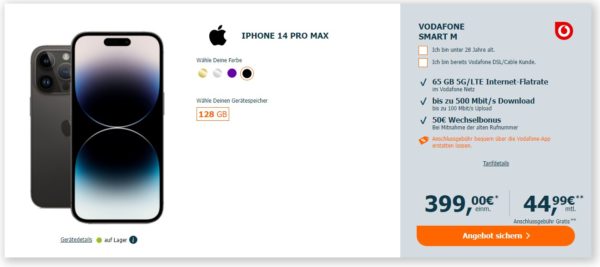 Apple iPhone 14 Pro Max + 65 GB LTE + Alles-Flat im Vodafone-Netz für 44,99€/Monat – eff. 8,96€/Monat