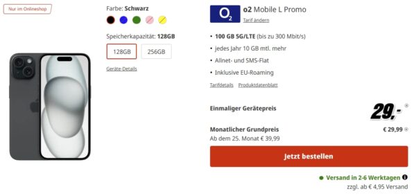 Bei MediaMarkt erhaltet ihr gerade das Apple iPhone 15 + 100 GB 5G AllnetFlat für eff. 1,86€/Monat!