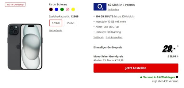 Schöner Deal zum Wochenende von MediaMarkt, dort bekommt ihr das Apple iPhone 15 + 100GB 5G + Allnet-Flat im o2-Netz für 29,99€/Monat