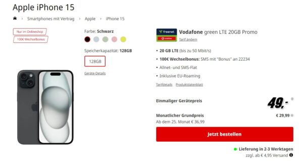 Richtig starker Deal zum Geburtstag bei MediaMarkt, dort bekommt ihr das Apple iPhone 15 + 20GB LTE + Alles-Flat im VF-Netz für 29,99€/Monat