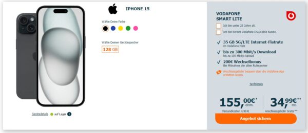Apple iPhone 15 + 35GB LTE/5G + Alles-Flat im Vodafone-Netz für 34,99€/Monat – eff. 0,45€/Monat + 200€ Bonus