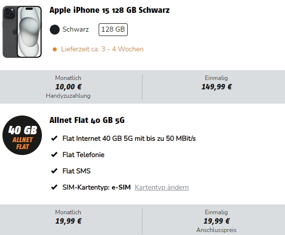 ⏰ *TOP* Apple iPhone 15 + 40 GB 5G Telekom AllnetFlat für eff. 4,20€/Monat