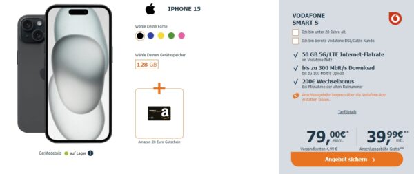 Schönes Angebot für all diejenigen die gerade nach einem Apple iPhone 15 samt Tarif im Vodafone-Netz suchen. 🙂