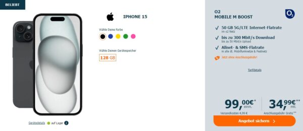 Apple iPhone 15 + 50GB LTE/5G + Alles-Flat im o2-Netz für 34,99€/Monat – eff. 6,86€/Monat