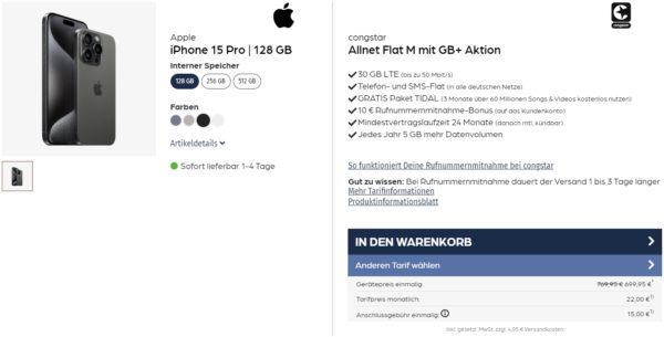 Schönes Angebot seitens Starmobile, dort bekommt ihr das Apple iPhone 15 Pro (128GB) + 25GB LTE + Alles-Flat im Telekom-Netz für 22€/Monat