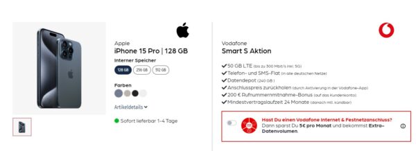 Apple iPhone 15 Pro (128GB) + 50GB LTE/5G + Alles-Flat im VF-Netz für 39,99€/Monat – eff. 4,82€/Monat + 200€ Bonus