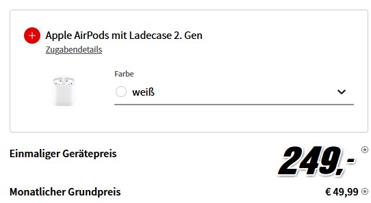 Zusätzlich gibt es die Airpods (2. Gen) ONTOP! Oder ohne die Airpods für nur 199€ Zuzahlung statt 249€.