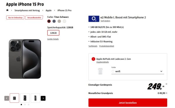 Bei MediaMarkt gibt es das Apple iPhone 15 Pro mit 128GB und dem o2 Mobile L Boost Tarif mit 140GB für 49,99€/Monat + Zuzahlung.