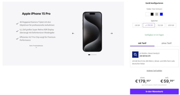 Noch auf der Suche nach dem iPhone 15 Pro bei DeinHandy bekommt ihr das Apple iPhone 15 Pro + 140GB LTE + Alles-Flat im o2-Netz für 59,99€/Monat