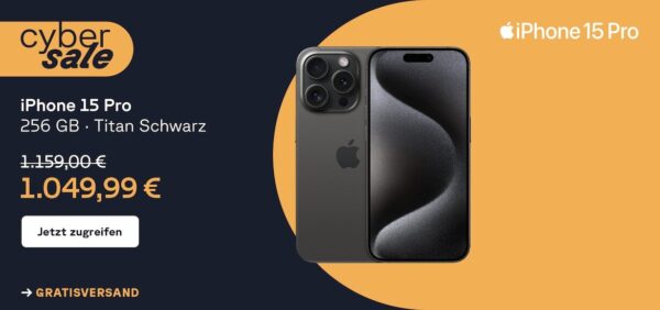 Bei Cyberport erhaltet ihr im CyberSale derzeit das Apple iPhone 15 Pro 256 GB für 1.049,99€ (Vergleichspreis: ~1.139€) Ersparnis ~89€