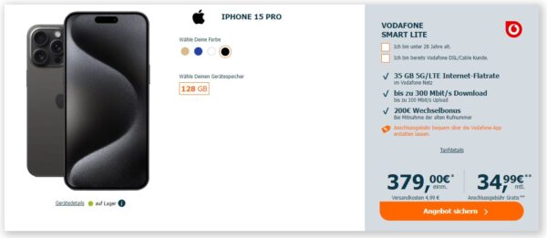 Apple iPhone 15 Pro + 35GB LTE/5G + Alles-Flat im VF-Netz für 34,99€/Monat – eff. 0,61€/Monat + 200€ Bonus