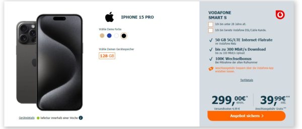 Apple iPhone 15 Pro + 50GB LTE + Alles-Flat im Vodafone-Netz für 39,99€/Monat – eff. 3,53€/Monat (GigaKombi, Young möglich)