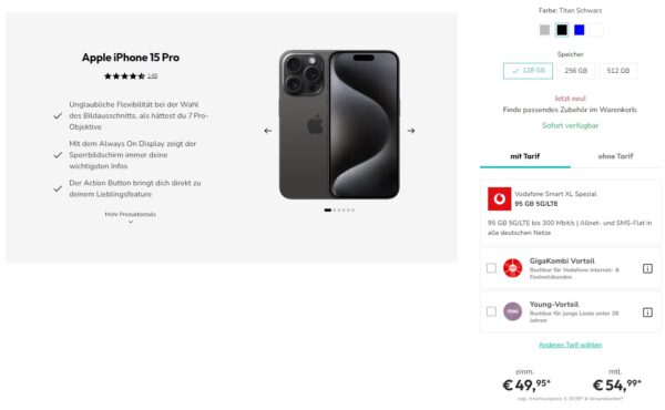 Apple iPhone 15 Pro + 95GB LTE/5G + Alles-Flat im Vodafone-Netz für 54,99€/Monat – eff. 7,82€/Monat
