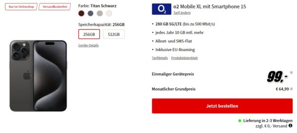 Bei MediaMarkt bekommt ihr das Apple iPhone 15 Pro Max + 280GB LTE/5G + Alles-Flat im o2-Netz für 64,99€/Monat