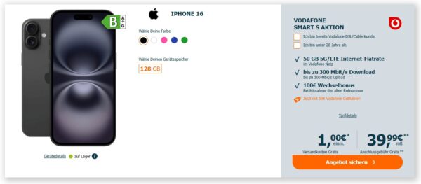 Apple iPhone 16 (128GB) + 50GB 5G + Alles-Flat im Vodafone-Netz für 39,99€/Monat – eff. 4,66€/Monat