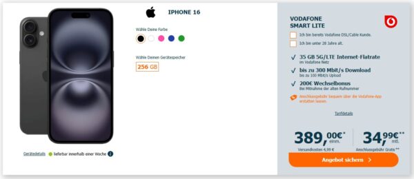 Apple iPhone 16 (256GB) + 35GB 5G + Alles-Flat im VF-Netz für 34,99€/Monat – eff. 1,99€/Monat dank 200€ Bonus