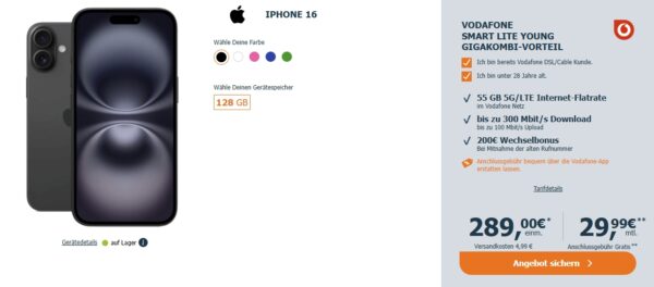Apple iPhone 16 + 35 GB Vodafone 5G/LTE AllnetFlat für eff. 2,82€/Monat