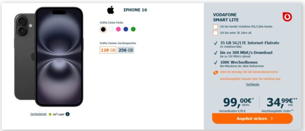 Apple iPhone 16 + 35GB 5G + Alles-Flat im VF-Netz für 34,99€/Monat – eff. 3,11€/Monat