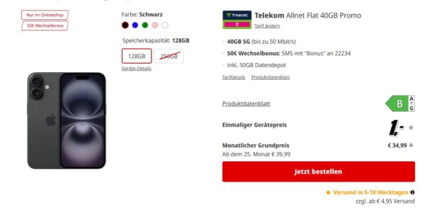 Apple iPhone 16 + 40GB 5G + Alles-Flat im Telekom-Netz für 34,99€/Monat – eff. 5,65€/Monat