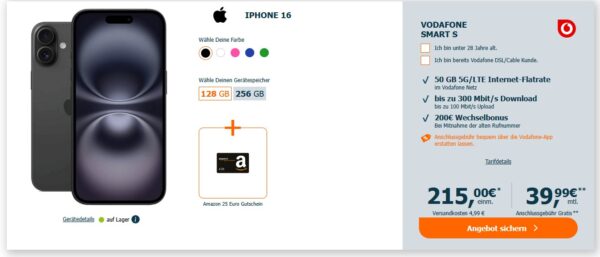 iPhone 16 + 50GB 5G + Alles-Flat im VF-Netz für 39,99€/Monat – eff. 3,19€/Monat dank 200€ Bonus