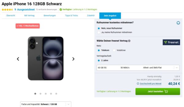 Apple iPhone 16 + 60GB 5G + Alles-Flat im Telekom-Netz für 39,99€/Monat – eff. 3,24€/Monat