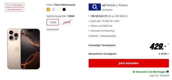 Neues Angebot seitens MediaMarkt, dort bekommt ihr das Apple iPhone 16 Pro + 100GB 5G + Alles-Flat im o2-Netz für 29,99€/Monat