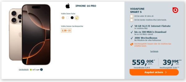 Apple iPhone 16 Pro + 50GB LTE/5G + Alles-Flat im VF-Netz für 39,99€/Monat – eff. 5,20€/Monat + 200€ Bonus