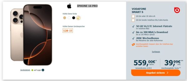 Apple iPhone 16 Pro + 50GB LTE/5G + Alles-Flat im VF-Netz für 39,99€/Monat – eff. 5,20€/Monat + 200€ Bonus