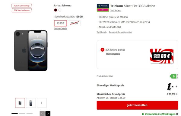 Apple iPhone 16e + 30GB 5G + Alles-Flat im Telekom-Netz für 29,99€/Monat – eff. 2,40€/Monat