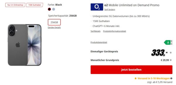 Wenn es das Apple iPhone 17 inkl. Tarif sein darf, dann bekommt ihr jetzt vielleicht genau das richtige Angebot bei MediaMarkt, das Apple iPhone 17 256GB + Unlimited 5G + Alles-Flat im o2-Netz für 29,99€/Monat