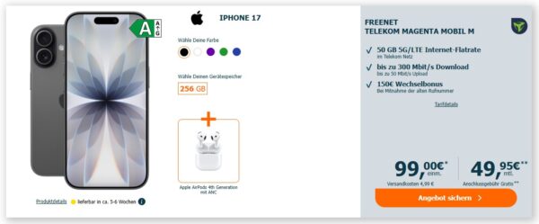 Apple iPhone 17 + AirPods 4 ANC + 50GB 5G + Alles-Flat (freenet Telekom MagentaMobil M) für 49,95€/Monat – eff. 1,99€/Monat
