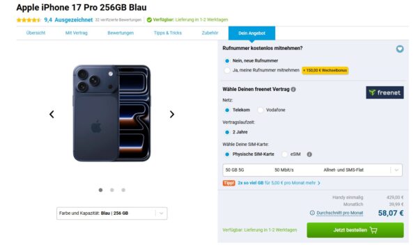 Apple iPhone 17 Pro 256GB + 50GB 5G + Alles-Flat im Telekom-Netz für 39,99€/Monat – eff. 1,45€/Monat