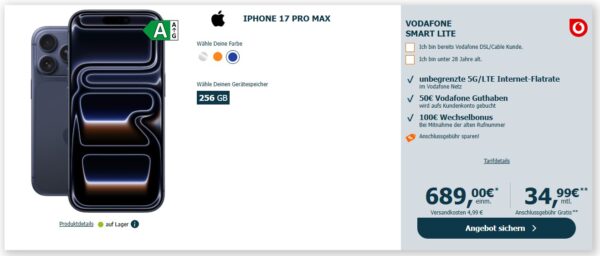 Apple iPhone 17 Pro Max 256GB + Unlimited 5G + Alles-Flat im Vodafone-Netz für 34,99€/Monat – eff. 3,70€/Monat