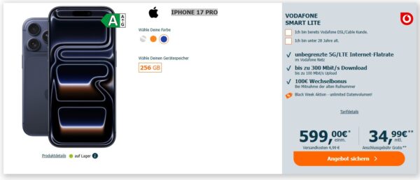 Apple iPhone 17 Pro + unbegrenztes 5G + Alles-Flat im Vodafone-Netz für 34,99€/Monat – eff. 4,07€/Monat