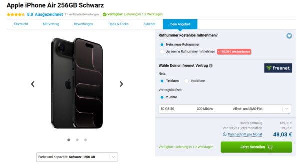 Apple iPhone Air 256GB + 50GB 5G + Alles-Flat im Telekom-Netz für 39,95€/Monat – eff. 2,24€/Monat