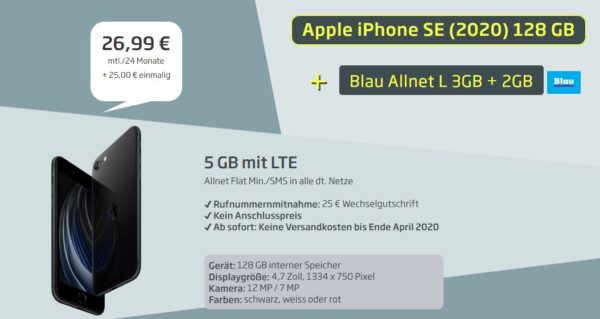 Apple iPhone SE (2020) (128 GB) + 5 GB LTE + Alles-Flat für 26,99€/Monat – effektiv 5,99€/Monat