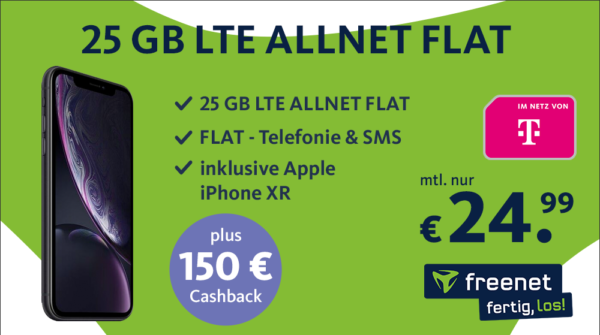 Apple iPhone XR gesucht dann bekommt ihr bei freenet genau das richtige Angebot, dort bekommt ihr das Apple iPhone XR (64GB) + 25GB LTE + Alles-Flat im Telekom-Netz für 24,99€/Monat