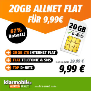 Noch auf der Suche nach einem SIM-Only Tarif? Bei klarmobil bekommt ihr die 20GB LTE Alles-Flat im Vodafone-Netz für 9,99€/Monat inkl. VoLTE / eSIM