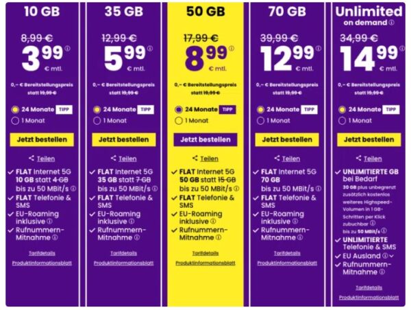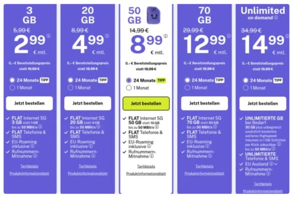 Die Auswahl ist riesig, aber wir haben euch die Rosinen herausgepickt. Besonders der „Kleine“ mit 3GB, der 50GB-Tarif und die Unlimited-Option sind preislich echte Ansagen.