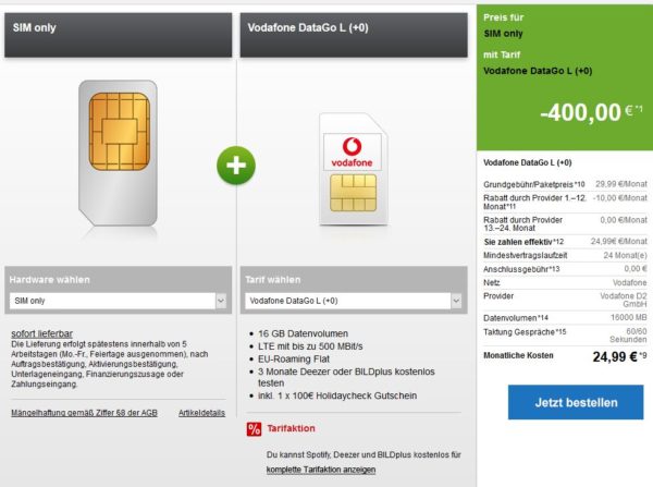 - Vodafone DataGo L (16 GB LTE) für eff. 24,99€/Monat + 400€ Cashback
