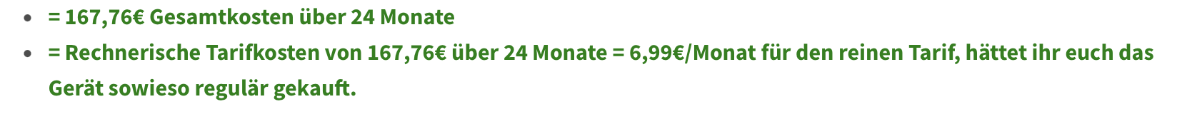 - = Rechnerische Tarifkosten von 167,76€ über 24 Monate