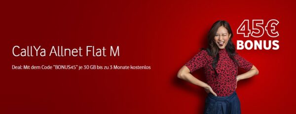Auf der Suche nach einem neuen Tarif? Bei Vodafone erhaltet ihr nun die CallYa AllnetFlat M mit 30 GB 5G/LTE Datenvolumen dank 45€ Startguthaben ganze 3 Monate komplett GRATIS! Der Tarif lässt sich ganz flexibel monatlich kündigen und auch ein möglicher Anschlusspreis entfällt. 😉