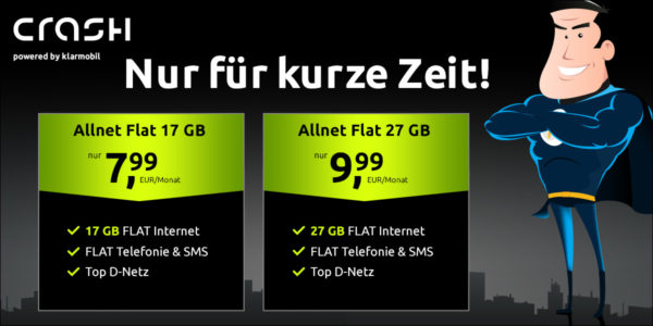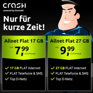 SUPER! Die beliebten Tarife aus dem Hause Crash sind wieder mal am Start… Insgesamt hat der Anbieter derzeit 2 Tarifangebote mit wahlweise 17 oder 27 GB im Vodafone-Netz für euch. 🙂