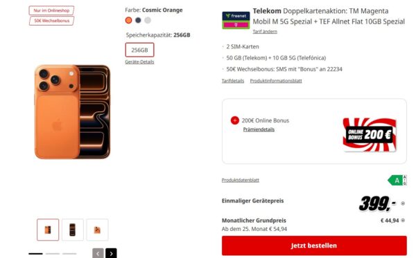 Starker Deal mit dem Apple iPhone 17 Pro Max im Telekom-Netz, bei MediaMarkt bekommt ihr das Apple iPhone 17 Pro Max 256GB + 50GB 5G + Alles-Flat im Telekom-Netz für 44,94€/Monat