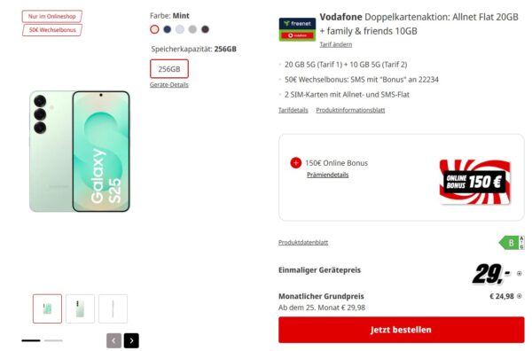 Bei MediaMarkt bekommt ihr das Samsung Galaxy S25 256GB + 20GB 5G + Alles-Flat im Vodafone-Netz für 24,98€/Monat