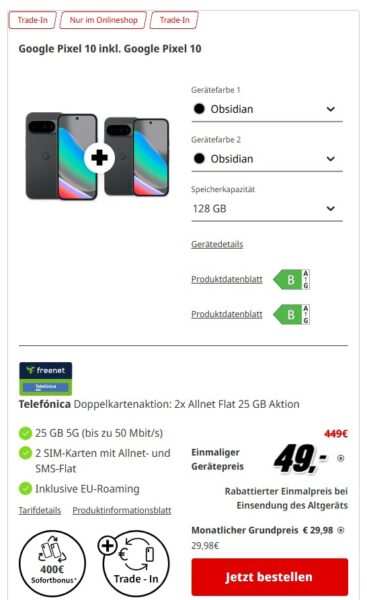MediaMarkt haut hier einen Deal nach dem nächsten raus, ihr bekommt hier 2x Google Pixel 10 + 2x 25GB 5G Alles-Flat im o2-Netz für zusammen NUR 29,98/Monat