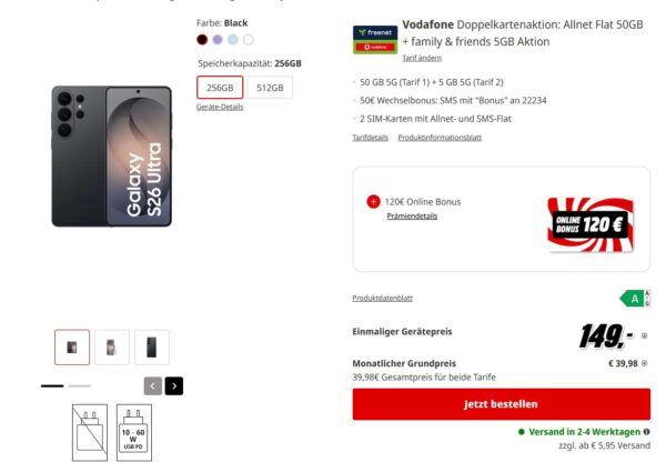 Richtig starker Deal seitens MediaMarkt, dort bekommt ihr das Samsung Galaxy S26 Ultra 256GB + 50GB 5G + Alles-Flat im Vodafone-Netz für 39,98€/Monat
