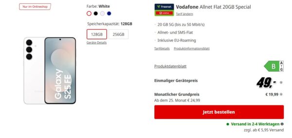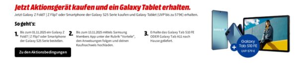Neuer Deal seitens MediaMarkt, dort bekommt ihr das Samsung Galaxy S25 FE + Galaxy Tab A11 + 20GB 5G + Alles-Flat im Vodafone-Netz für 19,99€/Monat